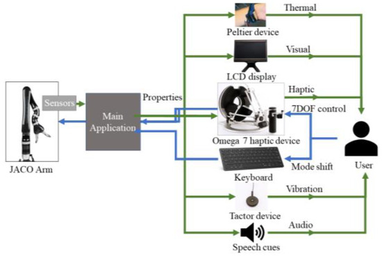 Users relying on robotic manipulators to interact with the environment are deprived of an experience comparable to direct object manipulation due to the lack of access to sensory information such as tactile, thermal, and force feedback. Such somatosensory feedback can convey information such as thermal and tactile properties of the object being manipulated. By doing so, they may contribute to enhancing situational awareness and aiding decision making relevant to the tasks being executed [14,15,16]. Multimodal feedback interfaces may provide effective solutions to bridging this gap and have been explored previously in several applications such as human–computer interaction and teleoperation [17,18].