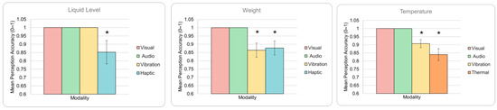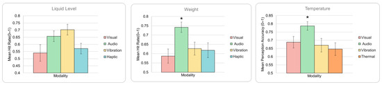 Perception accuracy: One-way ANOVA results for perception accuracy (Figure 5) show significant differences between modalities for all three properties with F = 4.52, p = 0.0051 for liquid level; F = 8.46, p = 4.427 × 10−5 for weight; and F = 17.32, p = 3.389 × 10−9 for temperature. The significant results for perception accuracy confirm that it is an important and relevant metric to be included in the cost function for identifying an appropriate mapping.