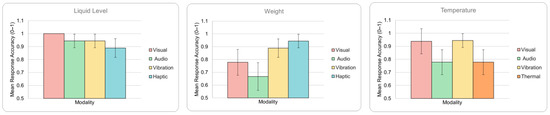 From Figure 5, it can be observed that the visual and audio modalities provided the best perception accuracy consistently across all properties and outperformed by modality-matched feedback (haptic to weight, temperature to thermal). This is not surprising as humans tend to favor visual and audio channels as general means for communication and learning [62]. For literate individuals, text, color, and speech cues are simple to learn and interpret, and can provide clear labels and representations of distinctions needed to be made. However, information processed through mechanoreceptors such as vibration and haptic perception do not provide the same resolution and are not as intuitive, especially when used as a substituted modality. Thermal perception is even lower in resolution likely due to the relatively sparse spread of thermoreceptors in the skin and is affected by the participant’s basal body temperature, which can influence the heat transfer rate and thus the perception of thermal cues [50]. However, it should be noted that all modalities yielded over 80% mean accuracy, supporting the choice of selected modalities and corresponding feedback configurations across the three properties despite the relative drawbacks.