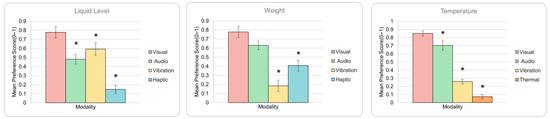 The subjective preference score metric (Figure 9) is by far the most distinct measure between modalities. While the preference scores indicate that the visual modality was preferred consistently across all modalities, it is peculiar that for the remaining modalities, preferences vary depending on the property. The visual modality preference can be explained by our natural affinity for processing visual information, the ease of understanding text and color representations, as well as attributes such as low memory and effort requirements to retain the different category levels. While the audio feedback can have similar advantages, one repeated comment during experiments was that the repetitive vocalization of the category was irritating. Thus, for liquid level, it may have been viewed as an unnecessary inconvenience. The low preference score for thermal feedback, although modality-matched, may have resulted from confusion arising from perceiving temperature changes from one trial to the next and from initial to target temperature, as well as learning the association between skin temperature perception and oral temperature perception, which for some of the middle categories may have been counterintuitive. Overall, the subjective preference metric can be seen to have captured a number of different factors that would be useful to consider, and also presents the most variation between modalities.