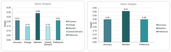 Metrics for weighting: Metrics for weights were generated through a subjective pairwise comparison completed by the nine participants after robot training and before the experiments. The resulting weights for all the metrics are shown in Figure 10. However, since some metrics were not significant in the screening experiment results, a second set of weights was generated with those metrics filtered out. ‘Attention’ represents the importance of visual attention on the task and is intended to isolate only DRT hit rate while ‘overall demand’ captures DRT reaction time.