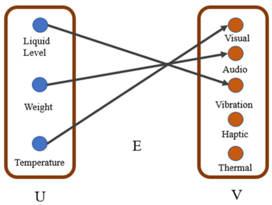 Bipartite graph for solution mapping assignment. The optimal solution mapped liquid level to vibration, weight to audio, and temperature to the visual display.