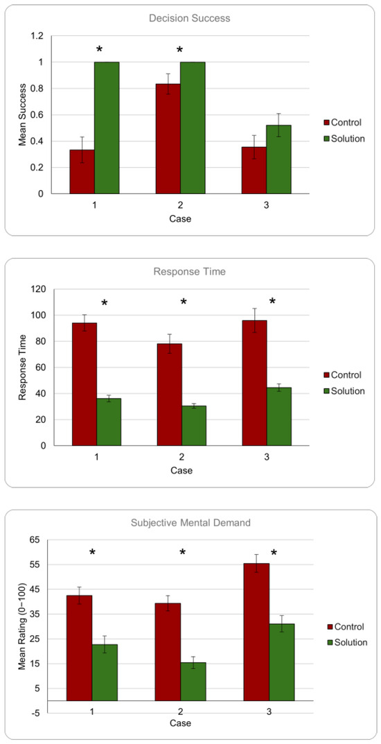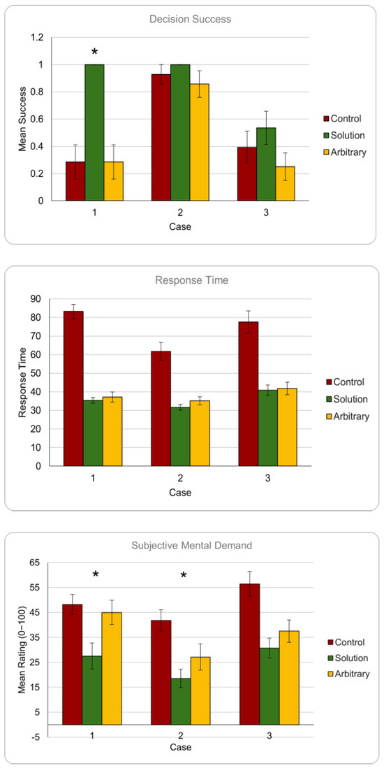 Solution vs. arbitrary and control means (7 subjects, 14 trials) for success (top), response time (middle), and subjective mental demand (bottom) in temperature (case 01), empty vessel (case 02), tilt angle (case 03) tasks. Error bars represent standard error. * indicates groups with solution significantly different from arbitrary solution.