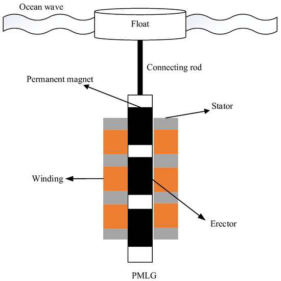 The structure of the conversion device in a direct-drive wave power generation system mainly consists of a floater and a permanent magnet linear generator. The floater captures wave energy, driving the mover of the permanent magnet linear generator to perform reciprocating linear motion. This motion induces an electromotive force (EMF) as the coils cut through the magnetic flux lines, converting mechanical energy into electrical energy. The induced EMF is then rectified through a rectification circuit for use, storage, etc. [13]. A schematic diagram of the direct-drive wave power generation system is shown in Figure 1.