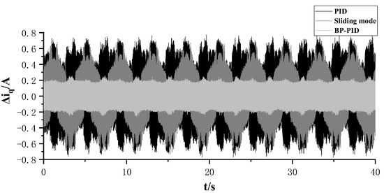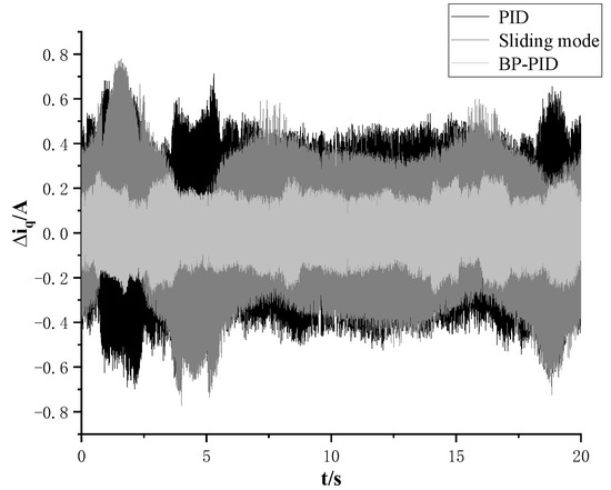Figure 8 shows the q-axis tracking current under three types of control, and Figure 9 shows the q-axis current tracking error under three types of control. It can be seen that under PID control, the q-axis current waveform has larger ripples, and the error is also relatively large, approximately around 0.6 A. Under sliding mode control, the q-axis tracking current and tracking error show some improvement compared to PID control, with an error of about 0.5 A. However, due to the chattering issue present in sliding mode control, the error does not significantly improve. Compared to PID and sliding mode control [25], it is evident that under BP neural network PID control, the waveform ripple significantly decreases, and the tracking error substantially reduces, with the error reduced to approximately 0.2 A, improving the accuracy of the system’s current tracking.