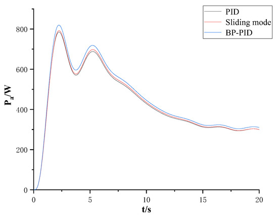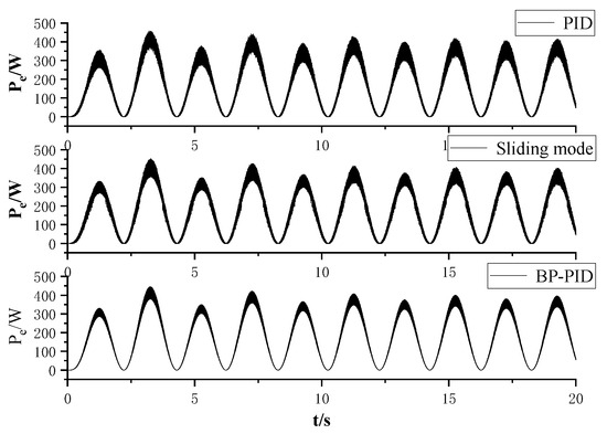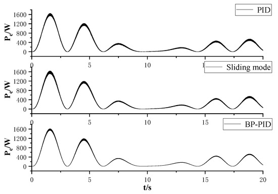 The system model was compared using three different control methods: PID control, sliding mode control, and BP neural network PID control. The simulation time was set to 20 s. The simulation compared the ripple size of the waveform and the tracking error to evaluate the control effect and analyzed the fluctuation in instantaneous power to judge the system’s stability.