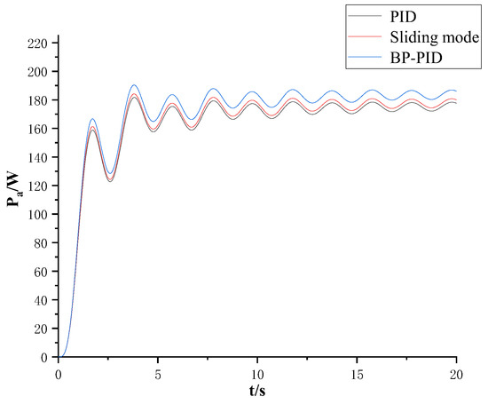 Figure 11 shows the system’s average power under different controllers. As seen in Figure 11, the system’s average output power under BP neural network PID control is approximately 10 W higher than that under the other two controls, which, due to the choice of relatively small parameter values, represents an increase of about 6%.