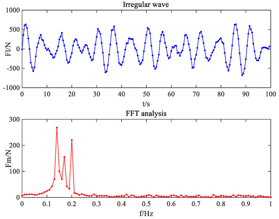 Firstly, a random irregular wave’s waveform is given, followed by the use of simulation software to perform a Fast Fourier Transform (FFT) on the inputted random irregular wave, with a sampling frequency of 2 Hz and a sample count of 200. The inputted irregular wave’s waveform and the resulting FFT spectrum analysis are shown in Figure 12. It can be seen that the irregular wave’s waveform in Figure 12 is composed of three sinusoidal signals of different amplitudes and frequencies and a disturbance signal. The irregular wave’s waveform in Figure 12 is approximately as follows: