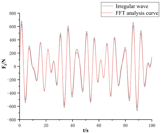 Figure 13 compares the given irregular wave’s waveform with the waveform obtained from FFT analysis. The given irregular wave’s waveform cannot directly serve as the input; in reality, the wave is a nonlinear excitation force. It requires a main frequency estimation method to predict the main frequency of the irregular wave excitation force. The amplitude and frequency obtained after FFT analysis must be compared with the original given irregular waveform to judge the reliability of the main frequency prediction method. According to FFT analysis, the composition of the amplitude and frequency of the irregular wave curve can be compared with the original irregular wave’s waveform. It is evident that the waveform obtained from FFT analysis has a small error compared to the given irregular waveform, making it suitable for analyzing irregular waveforms.