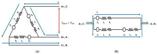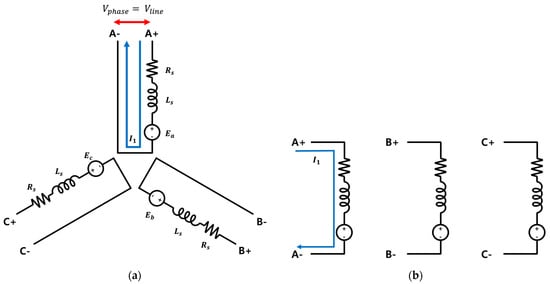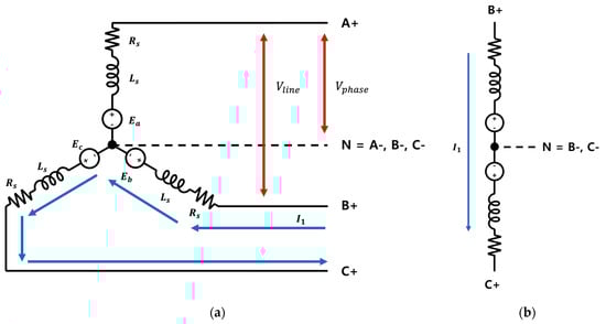 In the case of a Y-Connection BLDC motor, each of the three phases forms a neutral point, as shown in Figure 2a. The excitation structure applied to the armature is a two-phase excitation system, as depicted in Figure 2b, where two phases are excited by one voltage source. In this system, since two phases are excited by one voltage source, the available voltage per phase is reduced by half [15]. The reason why Y-connected BLDC motors are more commonly used than D-connected BLDC motors is that by not grounding the neutral point, they can remove the zero-sequence component of the third harmonic that causes inductive interference, thereby improving the waveform and reducing the effect of ripple on the BLDC motor operation. Additionally, the relationship between line-to-line voltage and phase voltage is advantageous for high voltages, and corona discharge and deterioration are prevented.