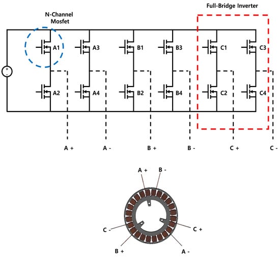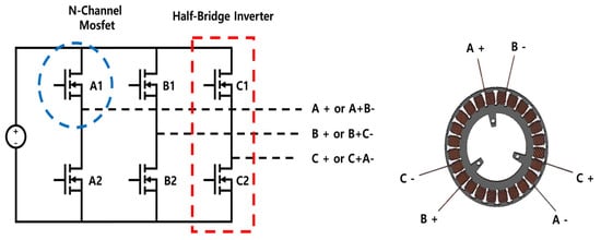 Unlike the six-step inverters of Y-Connection BLDC motors and D-Connection BLDC motors, the inverter structure of the independent three-phase BLDC motor, as shown in Figure 6, consists of three full-bridge inverters, with each full-bridge inverter controlling the switching on/off of one phase. The connection between the stator and a single pole in the inverter is illustrated in Figure 6. Furthermore, the independent three-phase BLDC motor has an identical electrical location with Y-Connection BLDC motors and D-Connection BLDC motors. As a result, controlling the signal output based on the Hall Sensor signals is easily achievable using the same Hall Sensor signals as shown in Table 4 [19].