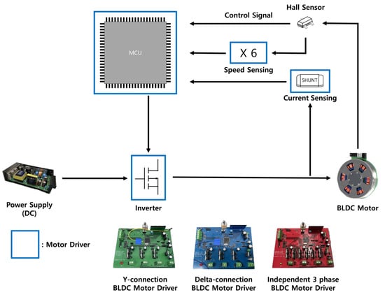 - Lee, Y.; Kim, J. Analysis of the three-phase inverter power efficiency of a BLDC motor drive using conventional six-step and inverted pulsewidth modulation driving schemes. Can. J. Electr. Comput. Eng. 2019, 42, 34–40. [Google Scholar] [CrossRef]