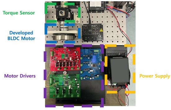 The proposed experiment’s overall layout and experimental test bed are depicted in Figure 7 and Figure 8. The aim of experiments is to compare the dynamic characteristics of Y-Connection BLDC motors, D-Connection BLDC motors, and independent three-phase BLDC motors to determine which winding structure is most suitable for robot joint actuators. To prevent variations in motor parameters due to changes in coil length based on the motor’s wiring junctions, the junctions for Y-Connection and D-Connection were made within the motor driver’s PCB. The parameters of the BLDC motors, including the stator resistance, the rated voltage is 24 V, and the switching frequency is 18 kHz. Speed calculation was performed using Hall sensor signals, and current measurement was performed using shunt resistors located at the bottom of the motor driver’s inverter.