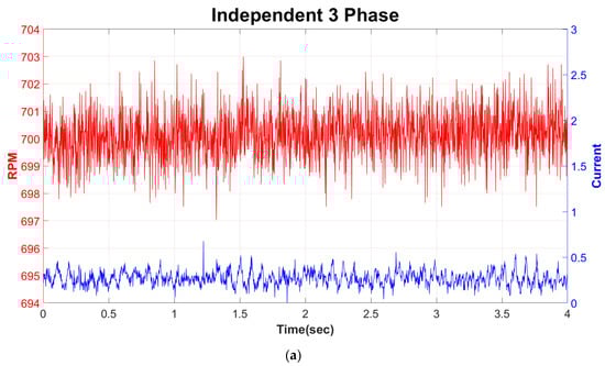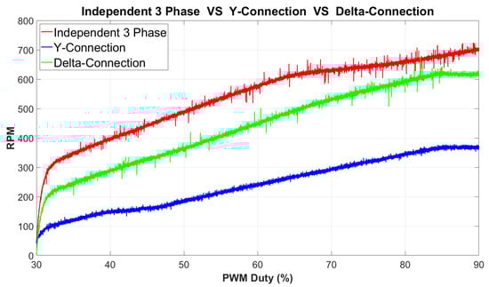 As shown in Figure 9, it was confirmed that the independent three-phase BLDC motor achieved the highest speed in all regions as the duty ratio increased from 30% to 90%. Additionally, as outlined in Table 6 in experiments comparing speed and current under identical voltage and duty ratios, the speed output exhibited the following trend: independent three-phase BLDC motor > D-Connection BLDC motor > Y-Connection BLDC motor. Moreover, comparing the independent three-phase BLDC motor with the Y-Connection BLDC motor, the former exhibited approximately 1.9-times-higher speed, even though it had a value about 4.9% lower than the theoretical value. Similarly, in comparing the Y-Connection BLDC motor with the D-Connection BLDC motor, the latter showed a speed approximately 1.67 times higher, yet about 3.79% lower than the theoretical value of times the speed saturation point. Additionally, comparing the independent three-phase BLDC motor with the D-Connection BLDC motor, while theoretically both types of motors should have the same saturation speed, experimental results revealed that the independent three-phase BLDC motor had a speed of about 86.73 RPM, which is 1.14 times higher. Therefore, these speed characteristic comparison results demonstrate that the speed characteristics of the motor can be improved by changing the winding structure of the motor.