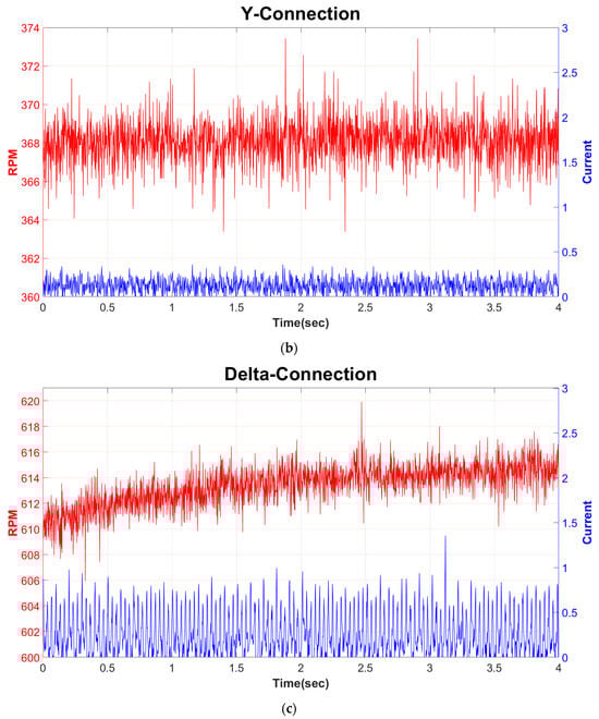 (a) Independent three-phase BLDC motor RPM and current at PWM Duty 90%; (b) Y-Connection BLDC motor RPM and current at PWM Duty 90%; (c) D-Connection BLDC motor RPM and current at PWM Duty 90%.