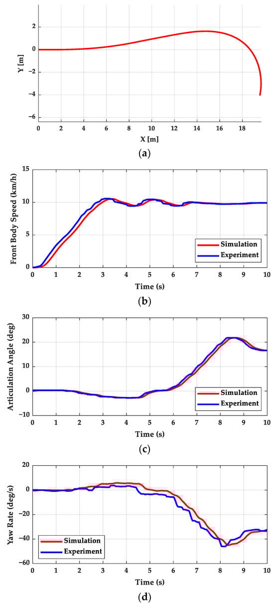- Oreh, S.T.; Kazemim, R.; Azadi, S. A new desired articulation angle for directional control of articulated vehicles. Proc. Inst. Mech. Eng. K J. Multi-body Dyn. 2012, 226, 298–314. [Google Scholar] [CrossRef]