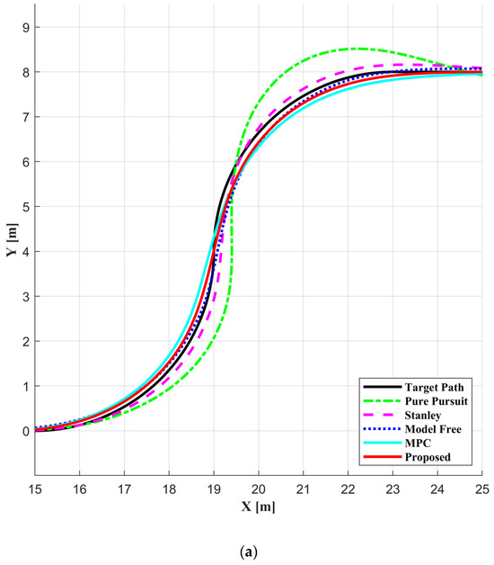 - Hiraoka, T.; Nishihara, O.; Kumamoto, H. Automatic path-tracking controller of a four-wheel steering vehicle. Veh. Syst. Dyn. 2009, 47, 1205–1227. [Google Scholar] [CrossRef]