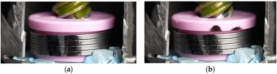 Due to significant speed fluctuations in the audio, which pose challenges in measurement using motion sensitivity, a high-speed camera with a frame rate of 360 Hz was employed to capture images of the overrunning spring clutches within the lifting system. Specific sections of the torsion spring components were marked with black notations. Sequential frames were selected, capturing instances when abnormal noise occurred. Some of these frames showed anomalies in the torsion spring section. Figure 3a represents a normal image, while Figure 3b shows an image with ghosting anomalies. The ghosting in the marked section resulted from the spring’s vibration, a phenomenon that can be described using motion blur, arising from the relative movement between the camera and the subject being photographed [].