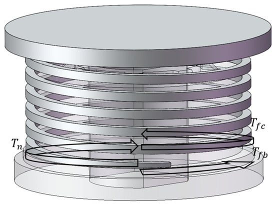 For the torsion spring clutch, [], where represents the elastic torque, and for a spring coil with turns, the friction torque is given by Equation (13):