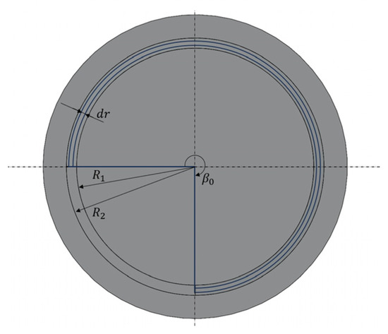 Considering a ring element with a width of , as depicted in Figure 8, the frictional torque for the ring element during the clutch’s initiation phase is expressed by Equation (15):