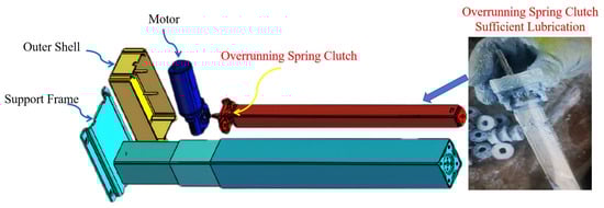 The operational state of overrunning spring clutches has a direct impact on the overall system’s stability, underscoring the pivotal need for dynamic analysis. Researchers such as Yan and Long [] analyzed the working principles of overrunning spring clutches. They established finite element models for these clutches and employed finite element analysis to investigate the dynamic characteristics of variable cross-section overrunning spring clutches. Cao et al. [,] conducted research on the engagement dynamic characteristics of an overrunning spring clutch, establishing a dynamic model of the clutch engagement state. They discussed the physical parameters determining the torque during clutch engagement and conducted dynamic experiments on clutch engagement. However, their work primarily focused on the dynamics of clutch engagement and did not provide substantial reports on the motion characteristics during reverse overrunning.