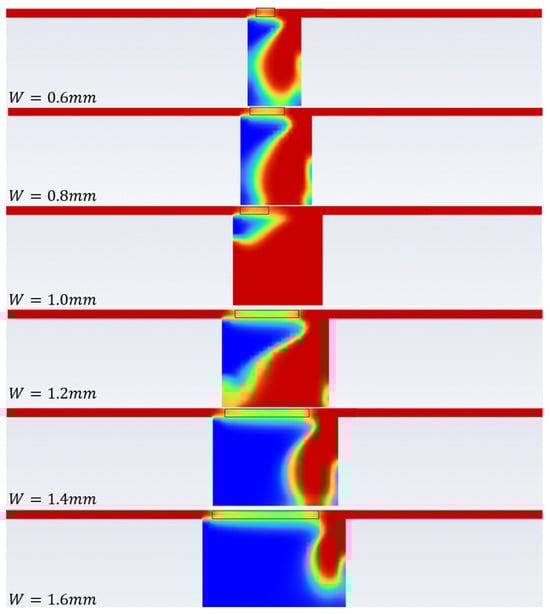 Figure 11 presents the lubricant distribution for the different lubricant fractions under various widths of the structure. Different colors denote distinct lubricant volume fractions, with red indicating the highest volume fraction and blue representing the lowest. The black box highlights sections of lubricant film breakage. The lubrication effectiveness was assessed based on the lubricant fraction and the length of the lubricant film breakage. A higher proportion of red indicates enhanced storage capacity for the structure, while a shorter breakage length suggests improved lubrication performance.
