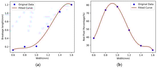 Polynomial curve fitting results. The relationship between the length of breakage and the structure width (a). The relationship between the red pixel percentage and the structure width (b).