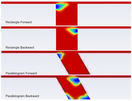 To mitigate the lubrication’s impact on the system’s self-locking performance, the structure shape was optimized to a parallelogram, as shown in Figure 13. The lubrication conditions for both working states before and after optimization are solved and compared in Figure 14. It is evident that the lubricant distribution in the optimized model aligned with the different lubrication requirements for the self-locking and surpassing working states, with a longer length of breakage in the self-locking state and shorter ones in the overrunning state.