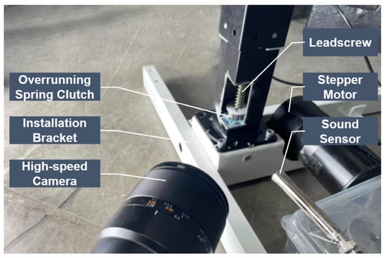 The experimental setup is shown in Figure 15. The overrunning clutch was fixed to the lower end through a mounting bracket, and the upper end was connected to the leadscrew. The leadscrew was driven by a stepper motor. In front of the clutch assembly, there were high-speed cameras and a sound sensor. The camera could capture 300 frames per second, and the sound sensor had a sampling frequency of 48 kHz. The high-speed camera, sound sensor, and stepper motor were all connected to a host computer, allowing real-time control and data acquisition of both sound and image information.