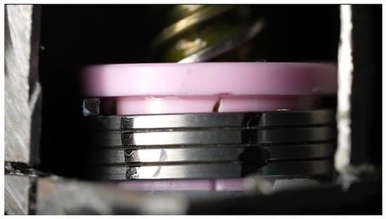 With a frame rate of 360 Hz, the peak times of the waveforms in Figure 4a,b are listed in Table 1. The peak times of the image correspond to those of the audio waveform, indicating a close relationship between the vibration of the torsion spring and the occurrence of abnormal noises. Notably, the peak times in the image align with those in the audio representation, suggesting periodic vibrations during the torsion spring’s operation. Furthermore, several predominant anomalies are observed during abnormal noise in the clutch, including noticeable resistance when rotating the torsion spring in reverse and severe friction at the tail of the torsion spring, leading to wear in the connecting seat. An analysis of these phenomena revealed that the primary source of the clutch’s abnormal noise lies in the vibration of the torsion spring component. The vibration results from force excitation, with only frictional forces and fixed-end interaction forces acting on the torsion spring component during its operation. While the fixed-end interaction forces remain relatively stable, the frictional forces during the torsion spring’s operation are intense and have a significant impact. Therefore, the abnormal noise in the torsion spring component is attributed to the vibrations generated by the frictional forces.