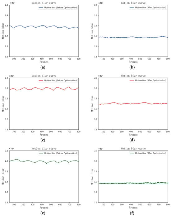 To further validate the improvement, tests were conducted on three sets of overrunning spring clutches, both before and after the enhancements. Using the method outlined in Section 2.1, the blur calculation was performed on the three sets of videos before and after the improvements, yielding the results shown in Figure 17a–f. Figure 17a,c,e represent the blur levels before the improvements, while Figure 17b,d,f represent the blur levels after the enhancements.