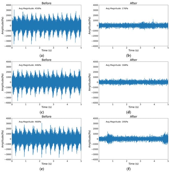 Figure 18a–f depicts the audio waveform graphs corresponding to three sets of videos before and after the improvement of the clutch, obtained by conducting a fast Fourier transform. Figure 18a,c,e represent the audio waveforms before the improvement, while Figure 18b,d,f represent the audio waveforms after the improvement. The average amplitude index of the audio waveforms before the improvement was 452.0 Pa, and the waveforms exhibited significant periodic fluctuations. After the improvement, the average amplitude index of the audio waveforms was 179.7 Pa, which was reduced by 60.2% compared to before, and the waveforms no longer exhibited significant periodic fluctuations. Therefore, the improvement significantly suppressed the abnormal noise in the overrunning spring clutch. Based on the analysis from Figure 16, Figure 17 and Figure 18, the spring modification method proposed in this paper effectively reduces spring-induced frictional self-excited vibrations, thereby preventing the occurrence of abnormal noise in the overrunning clutch during overrunning operation.