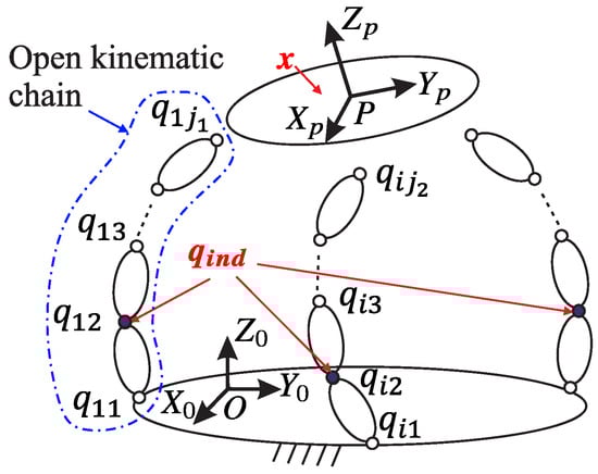 Each open kinematic chain, also known as a limb, consists of interconnected links joined by joints. The relative motion between the links within a limb is described using generalised coordinates, denoted as , which may represent translational or rotational motion at any given instance [2]. The pose is controlled by a subset of active or actuated joints .