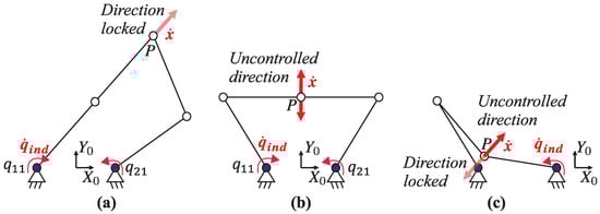 Type III: Both and become rank-deficient simultaneously. This configuration occurs only for specific geometric parameters of the links. Figure 2c shows an example using a four-bar mechanism, or 4R PKM.