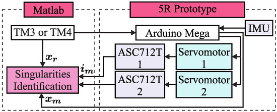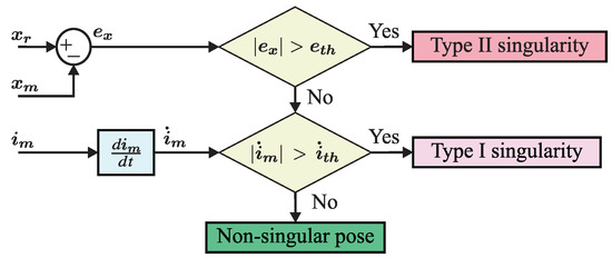 A schematic diagram of the sensor-based identification of Type II singularities for the 5R PKM is shown in Figure 10, and its code executed in Matlab is depicted in Algorithm 2.