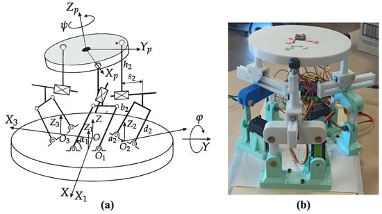 L-CaPaMan is a prototype of a PKM designed for earthquake simulation, featuring three DOFs [32]. This PKM operates by controlling translation along the axis and rotations and using three angular actuators, denoted as , , and , as illustrated in Figure 4a.