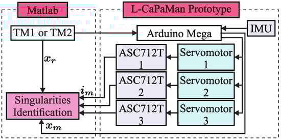The reference trajectories (TM1 or TM2) are sent from Matlab R2023a code to the control unit of the L-CaPaMan PKM via serial communications at a baud rate of 115,200. The control unit is an Arduino Mega, manufactured in Italy by Arduino.cc, that modifies the pose of the end-effector using three servomotors in the PKM. All the measurements are sent from the Arduino Mega to Matlab for numerical identification of the singularities. Figure 5 shows a schematic diagram of the sensor-based identification of Type I singularities for the L-CaPaMan PKM, and Algorithm 1 details the code executed in Matlab.