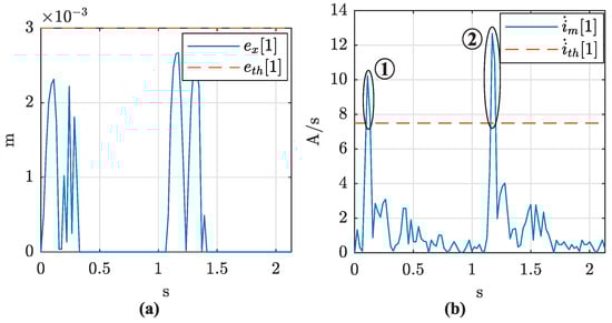 Results of testing TM4 with the 5R PKM: (a) absolute position error for ; (b) time derivative of the current consumed by actuator 1.