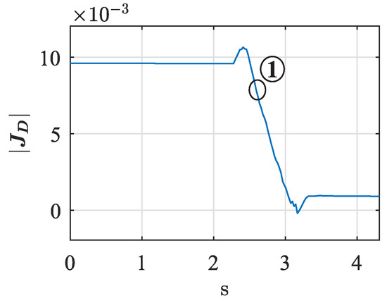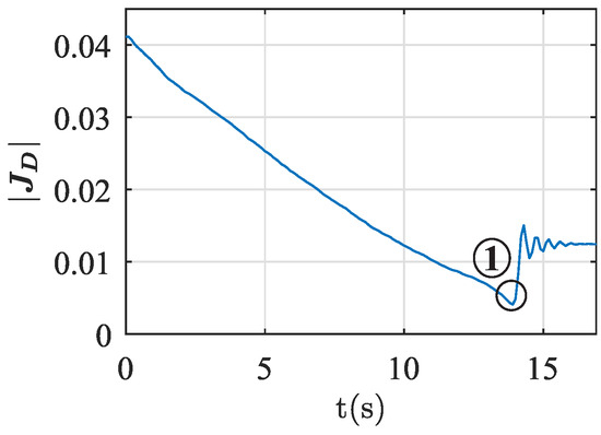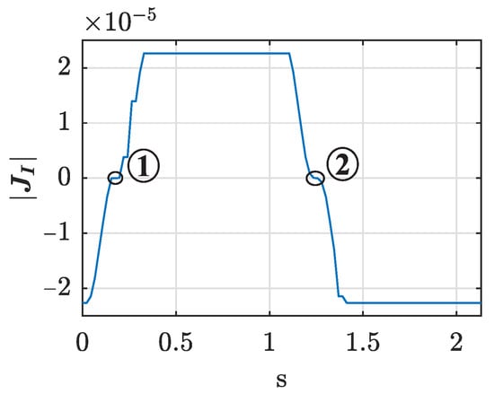 Although the mobile platform executed a controlled motion during TM1, the current consumed by the actuators presented two sudden changes. Figure 6b shows the rate of change of the current consumed by actuator 1. It verifies that detected the two peaks of the current corresponding to a Type I singularity. Figure 7 shows that the two peaks of the current detected by occurred when crossed zero.