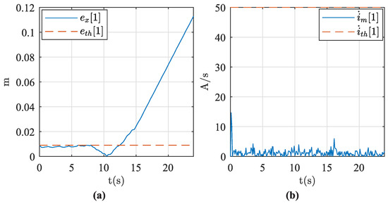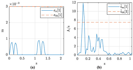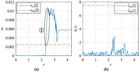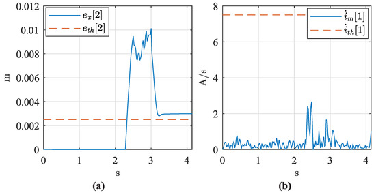 During the execution of TM3, the 5R mechanism lost control of the position of point P in the closeness to the expected Type II singularity. Figure 11a shows that the absolute position error for the vertical DOF () exceeded the corresponding threshold () starting from the time instant 2.4 s. This figure verifies that the PKM was unable to track the reference frame after 2.4 s, i.e., a Type II singularity occurred. During the execution of TM3, there were no sudden changes in the current consumed by the actuators. Figure 11b shows the absolute derivative of the current consumed by actuator 1 ().