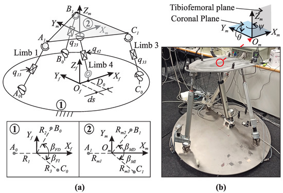 The four DOFs of the PKM consist of two translational movements (, ) in the tibiofemoral plane, along with rotations (, ) around the coronal and tibiofemoral planes, respectively [35]. These four DOFs are controlled by four linear actuators, denoted as , , and , as shown in Figure 14a.