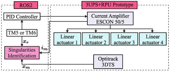 The sensor-based singularity identification method was developed on an industrial computer using ROS2, as reported in Figure 15. Reference trajectories TM5 or TM6 are sent to a PID controller that drives the four prismatic actuators of the PKM (, , , and ) using an ESCON 50/5 current amplifier powered at 24 V, manufactured in Sachseln, Switzerland by Maxon motor ag. The current amplifier provides a nominal power of 250 W and accurate feedback of the current consumed by the actuators using an analogue output channel with a 12-bit resolution at 53.6 kHz. The actual pose of the mobile platform of the 3UPS+RPU PKM is measured by a 3D tracking system (3DTS) manufactured by Optitrack, with an accuracy of 0.1 mm. The 3DTS system consists of 10 infrared Flex 13 cameras with a resolution of 1.3 Megapixels at 120 Hz.