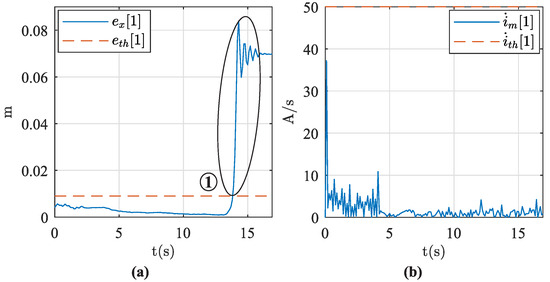 During the execution of TM5 and TM6, the 3UPS+RPU PKM lost control over the mobile platform in the closeness to the expected Type II singularities. Figure 16a shows that the PKM under study increased the error tracking on () at time instant 13.9. When the 3UPS+RPU PKM lost control over the end-effector, the current consumed by the actuators exhibited no sudden increments. Figure 16a shows the absolute derivative of the current consumed by actuator 1 () during the execution of TM5.