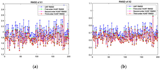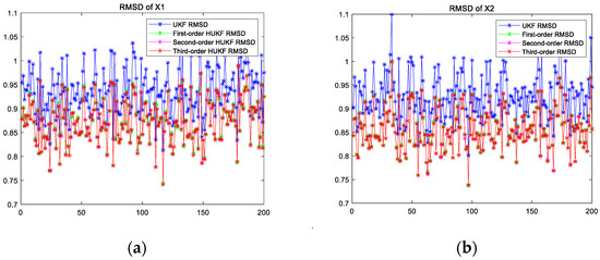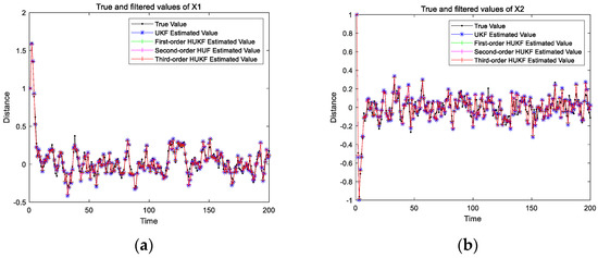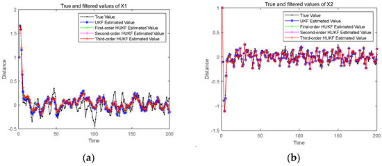 where the state noise and the measurement noise are both uncorrelated white Gaussian noise and obey the following distribution: , , , . The initial values of the system are and . At the same time, the relevant parameters in the Unscented Transformation are set to , , , and . The simulation results are shown in the following figures. Figure 3a,b present the output curves of the true value of state X1 and state X2, the estimated value of the UKF, and the estimated value when the proposed filter is extended to the first and second orders. Figure 4a,b show the estimated error output results of the above filter in state X1 and state X2, respectively. Table 2 shows a comparison of the mean square errors of each filtering method after the system is stabilized.