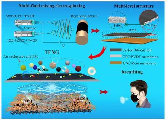 With the rapid development of science and nanomaterial preparation technology, wearable electronic devices have attracted significant attention [1]. To adapt to various application conditions, the functionalization of wearable electronic devices has become an inevitable trend. However, technological progress and industrial production have brought about increasingly serious environmental pollution, so the development of wearable electronic devices that can be used for human respiratory protection has become an urgent need. At present, shortness of breath and respiratory failure or even cessation have been caused by severe diseases endangering human health. Pollutants in the air mainly include harmful chemical gases and particulate pollutants [2]. People should not only protect themselves against the hazards of outdoor air but also spend more time protecting against harmful air substances in relatively closed spaces or buildings, such as flying dust in the working environment and volatilization of formaldehyde gas from indoor furniture [3,4]. As the concentration of pollutants in indoor air is two to five times higher than that in outdoor air [5], wearable electronic protective equipment is very necessary. The main function of these electronic devices is to remove particulate matter (PM) and harmful chemical gases in the air to alleviate related respiratory health problems [6,7]. Moreover, the unique surface morphology and physical properties of wearable electronic devices can be used in many situations to achieve multi-functional applications. For some patients with long-term chronic respiratory diseases, the resulting shortness of breath or even respiratory arrest from particulate matter can seriously threaten human life and health. Fortunately, real-time detection of these respiratory diseases can be achieved through wearable electronic devices. Therefore, the development of a new type of flexible wearable electronic device is of practical significance for physical protection and respiratory disease monitoring. As a kind of wearable electronic device, the new type of triboelectric device has great application potential in energy harvesting, medical monitoring, and artificial intelligence [8,9,10,11,12,13,14,15,16,17].