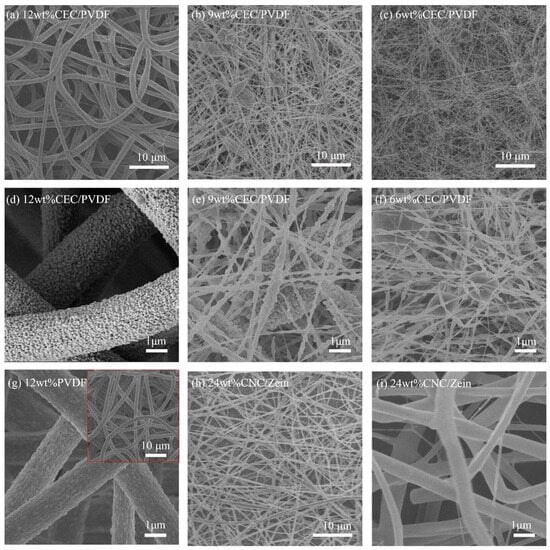 SEM images of CEC/PVDF nanofibers with different solution concentrations (a–f), 12 wt% PVDF nanofibers, the illustration is an enlarged image (g), and 24 wt% CNC/zein nanofibers (h,i).