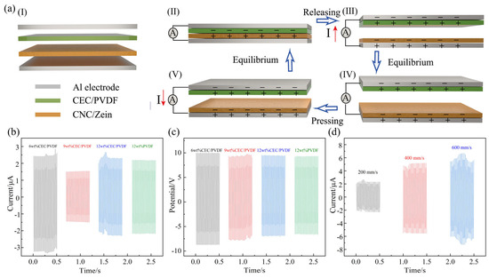 The effects of nanofibrous morphology on the electrical output performance of TENG is shown in Figure 3. The aluminum (Al) collector in electrospinning was directly used as the electrode, and different concentrations of CEC/PVDF nanofibers and 24 wt% CNC/zein nanofibers were performed as the two dielectrics to form the TENG. Its working model was a vertical contact separation mode to collect energy [37,38], and its structure is shown in Figure 3a(I). The electricity generation process of the TENG is depicted in Figure 3a(II–V). When the membranes were pressed, the top membrane and bottom membrane contacted and rubbed against each other. According to the triboelectric series, CEC/PVDF is much more triboelectrically negative than CNC/zein. When another CNC/zein dielectric was in contact with its surface, charges would transfer from the CNC/zein to the CEC/PVDF, which would make the CEC/PVDF negatively charged, and the CNC/zein had the same amount of positive charges (Figure 3a(II)). When the TENG was separated, the opposite and equal charges were generated on the respective aluminum electrodes due to electrostatic induction, and the top Al electrode possessed a lower electric potential than the bottom Al electrode, generating an electric pulse which drove the electrons flow to flow through an external load from the top Al electrode to the bottom Al electrode (Figure 3a(III)). When the membranes were moved close to each other again, the redistributed charge would form a reverse electrical pulse, driving the charge to flow in the opposite direction (Figure 3a(V)). Therefore, when a new equilibrium was reached, an alternating electron would be observed with cycles of contacting and separating process. According to the working principle of the TENG (Figure 3a), an instantaneous current and voltage of positive and negative was measured when the TENG was driven by a cyclic reciprocating motion of the linear motor.