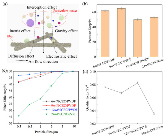 Schematic diagram of nanofiber filtration (a); pressure drop of CEC/PVDF nanofibrous membranes with different concentrations and 24 wt% CNC/zein nanofibrous membrane (b); filtration efficiency of particles at different sizes (c); QF of CEC/PVDF nanofibrous membranes with different concentrations and 24 wt% CNC/zein nanofibrous membrane (d).