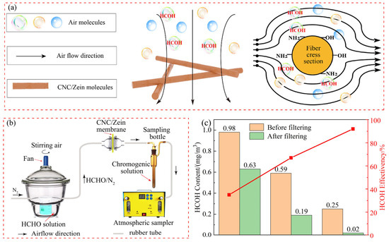Formaldehyde (HCHO) is a very common and harmful chemical gas that exists in various places of human activities. It combines with proteins in the human body and endanger human health. Therefore, removal of HCHO is a very necessary function for filters to protect human health. As a protein extracted from corn, zein is an effective material for removing HCHO. Its numerous functional groups can provide protein–gas chemical interactions, as shown in Figure 5a. The addition of CNC can greatly enrich the functional groups of zein molecules. CNC/zein nanofibers possess various functional groups (such as carboxyl, amino, and hydroxyl charged groups, and many polar/non-polar functional groups). These functional groups can be used as active sites to produce a variety of interactions among chemical pollutants, including hydrogen bonds, ionic bonds, charge–charge interactions, and so on [43,44]. HCHO has high reactivity and can undergo nucleophilic addition reactions with CNC/zein nanofiber with −OH, −SH, and −NH2 groups. When HCHO passed through the filter medium of CNC/zein nanofibers, it was removed through chemical reactions. The volatilization of the HCHO solution was used to simulate the indoor HCHO environment, and the experimental detection device is shown in Figure 5b. By adjusting the concentration of the HCHO solution, we prepared three different HCHO gas concentrations at 0.25 mg/m3, 0.59 mg/m3, and 0.98 mg/m3, which was higher than the safe concentration of 0.08 mg/m3, to test the HCHO efficiency. After the CNC/zein nanofiber filtered the HCHO in the air, their removal rates were 92%, 67%, and 35%, respectively, as shown in Figure 5c. Figure 5c illustrates the color change diagram after the reaction of HCHO gas with the detection solution before and after filtration at an HCHO concentration of 0.25 mg/m3; it can be seen that the color of the reaction solution after filtration is basically the same as that of the standard solution. When HCHO gas passed through the CNC/zein filter, the concentration of HCHO was reduced from 0.98 to 0.25 mg/m3, and the capture efficiency was increased from 35% to 92%, higher than other formaldehyde filtration materials like keratin powder (90.63%) and keratin/PVP-based composite materials (90.39%) [45].