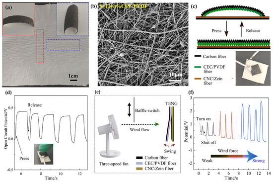 This unique multi-level structure can not only harvest energy but also act as a pressure self-powered sensor. The CEC/PVDF membrane was cut into 1 × 1 cm2 to detect finger pressure, as shown in Figure 6d. An electrochemical workstation was used to detect the change in the open-circuit voltage of the TENG with the pressure of the finger. The sensing principle of the TENG is shown in Figure 6c. When the TENG was not pressed, it did not generate electrical signals. When the finger pressed down, the arched CEC/PVDF dielectric was transformed into a flat shape; if the pressure was large enough, the wavy shape would also be stretched out, deforming the size of the friction contact area of the TENG and thereby generating electrical signals until the open-circuit voltage reached the highest value. When the finger was released, the contact surface between the two dielectrics was quickly separated, which reduced the charge generated by friction. With the repeated pressing and release, the peak of the open-circuit voltage appeared repeatedly. From Figure 6d we can see that the waveform and peaks of each wave were basically the same; this indicated that the self-powered sensor had better reproducibility for the same pressure detection. In addition, the TENG exhibited good filtering performance and unique structure, which was expected to be constructed into a sensor the size of a breathing valve on a mask to detect the breathing state. We assembled the TENG into a 3 × 3 cm2 area as a wind detector. A three-speed fan was used as a power, and the baffle that it could move up and down were regarded as a wind switch. The change in the TENG electrical signals under different wind force were detected by adjusting the wind speed of the fan (Figure 6e). Figure 6f is the open-circuit voltage change diagram of the TENG under different wind force levels. As the wind force increased, the open-circuit voltage also continued to increased. This was mainly because the increase in wind force caused the increase in contact area between the dielectrics, so more charges were generated on the surface of the dielectric. In summary, the TENG can detect the magnitude of the wind, and it is expected to be used for breathing detection with further research.